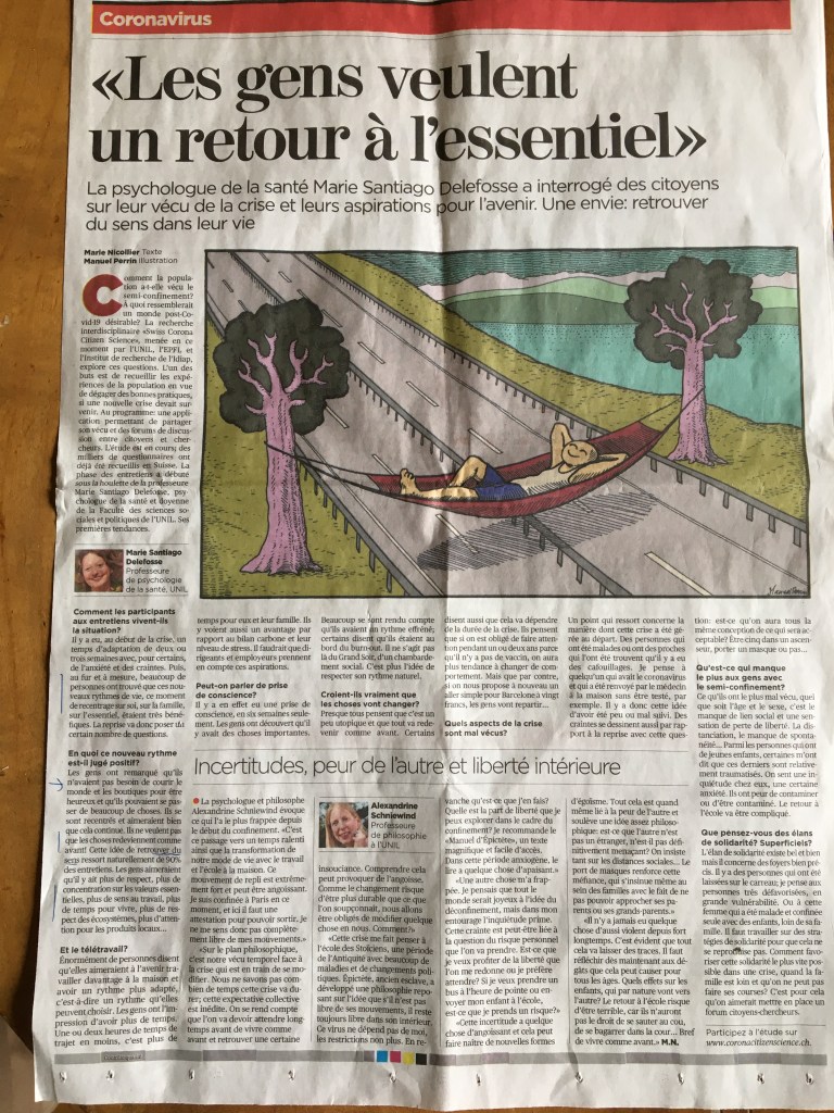 Excellente interview de la professeure Marie Santiago Delefosse dans 24h du 4 mai. Son enquête sur la situation actuelle et ses effets sur la population est remarquable. Après le choc de l’annonce et la déstabilisation qui s’en est suivie, beaucoup d’enquêtés ont remarqué dans le confinement qu’une autre vie est possible, plus satisfaisante, plus apaisante. Un recentrage sur soi, sur la famille. Faire autre chose que d’accumuler, que de s’agiter et de courir… La professeure cite : « plus de respect, plus de concentration sur les valeurs essentielles, plus de sens au travail, plus de temps pour vivre, plus de respect des écosystèmes, plus d’attention pour les produits locaux ». Un beau programme, souhaitable, nécessaire même…