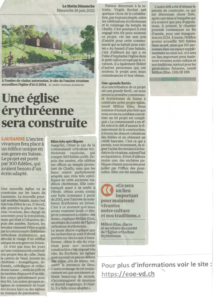 La communauté érythréenne du canton de Vaud va pouvoir se construire un lieu de culte à elle ! Elle a obtenu les autorisations nécessaires et le chantier pourra commencer !