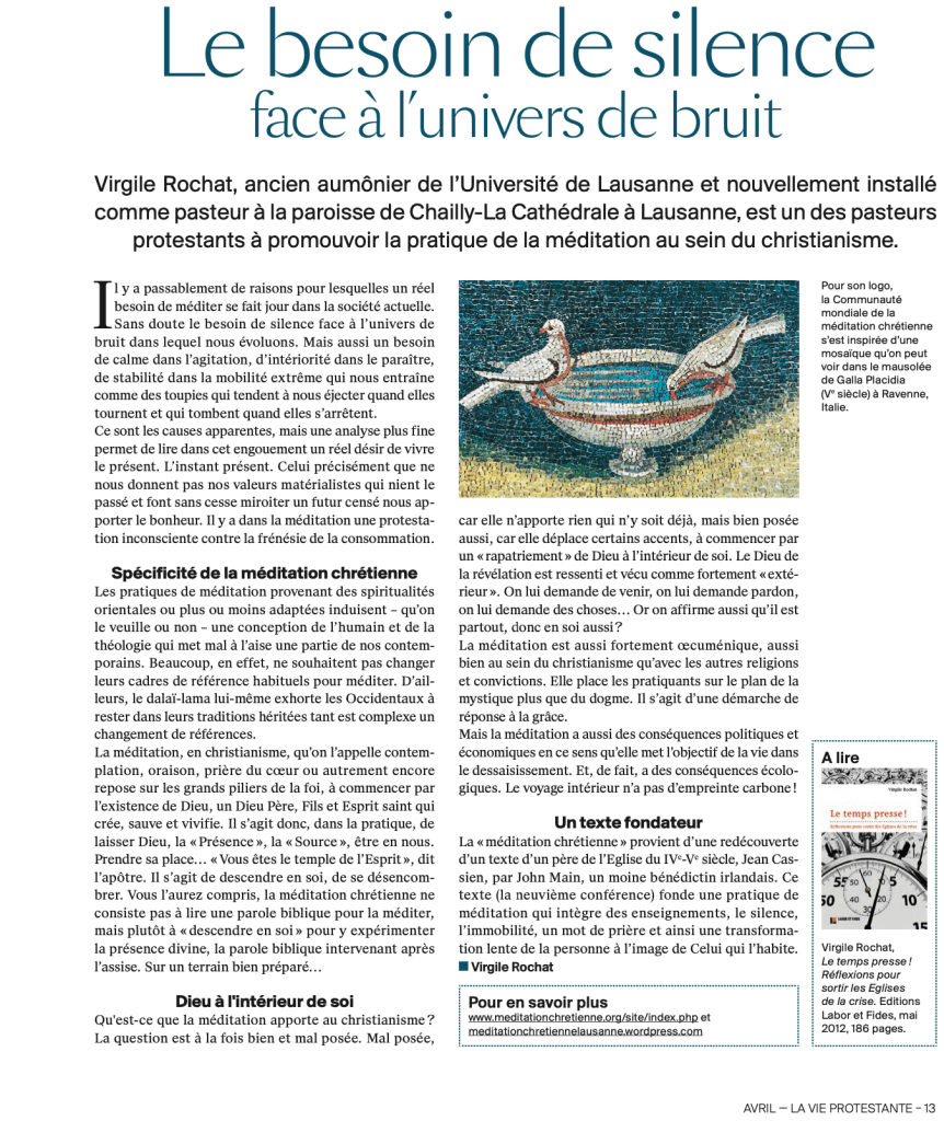 En avril 2015, la « Vie Protestante genevoise » publiait un numéro sur la méditation avec une interview. A part les circonstances temporelles, il me semble qu’il n’a rien perdu de son actualité :