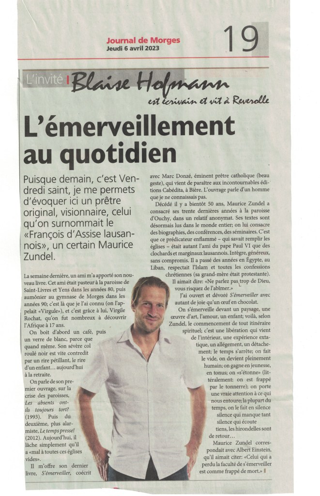 Il y a quelques jour une petite anthologie de textes de Maurice Zundel est parue chez Cabédita. Elle a été réalisée par Marc Donzé (le spécialiste de Zundel) et moi-même. Blaise Hofmann, l’écrivain vaudois bien connu et a rendu compte dans un de ses billets du journal de Morges. Je ne résiste pas à le faire paraître dans mon Blog. Bonne lecture ! (et peut-être bonne lecture du livre ? )